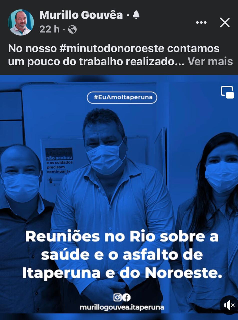 O secretário de governo , filho do prefeito Alfredao e pré candidato a deputado federal Murillo Gouveia fez publicação em sua rede social que levantou questionamentos de muitos internautas. Na publicação o filho do prefeito Alfredao diz que esteve na capital do Estado tratando sobre asfaltamento em Itaperuna e região Noroeste Fluminense a pedido de seu pai para ajudar os municípios. Ao que se sabe tanto Murillo quanto Alfredao não podem falar em nome de outro município exceto Itaperuna, onde figuram como autoridades MUNICIPAIS e não regionais ou estaduais, tanto que seus salários são pagos pelos contribuinte de Itaperuna . Segundo alguns internautas isso seria uma manobra do filho do prefeito se utilizar da posição de secretário para prover sua pré campanha a deputado federal utilizando a “máquina pública “ que financia suas viagens com objetivo de acordos políticos.