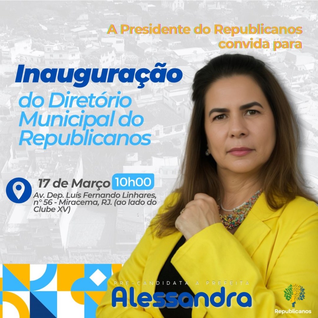 Pré-candidata a prefeita de Miracema-RJ com grandes chances de ocupar a cadeira de chefe do Executivo municipal, a presidente municipal do Republicanos convida a todos para que neste domingo 17 de março participem da inauguração do Diretório Municipal de seu partido.